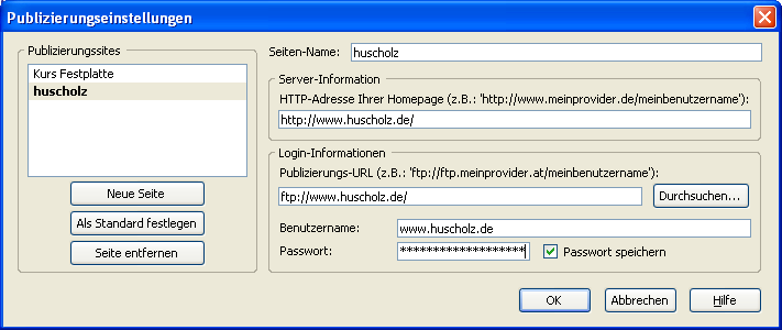 To check whether Nvu/KompoZer's Publish works at all, install with the freshly loaded programme a site somewhere on your hard disc and publish a "Hello World" to there, thus finding out that the installation of Nvu/KompoZer is correct.