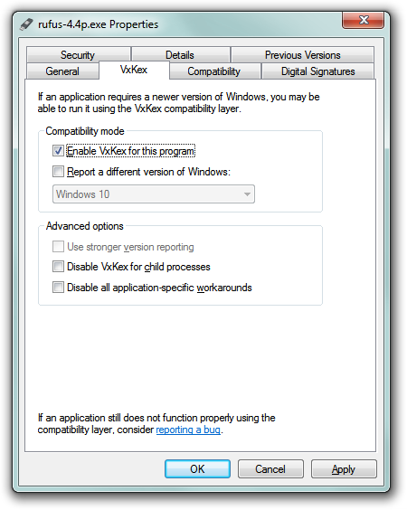 1. Just right click on a program (.exe or .msi), open the Properties dialog, and select "VxKex" tab. Then, check the check box which says "Enable VxKex NEXT for this program", and try to run the program. For shortcuts, select "Shortcut" tab in the Properties dialog, click "Open file location" button, and then perform the actions above.