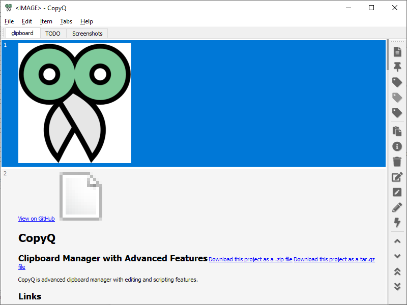 CopyQ monitors system clipboard and saves its content in customized tabs. Saved clipboard can be later copied and pasted directly into any application. Store text, HTML, images or any other custom formats. Quickly browse and filter items in clipboard history. Sort, create, edit, remove, copy/paste, drag’n’drop items in tabs. Add notes or tags to items. System-wide shortcuts with customizable commands. Paste items with shortcut or from tray or main window. Fully customizable appearance. Advanced command-line interface and scripting. Ignore clipboard copied from some windows or containing some text. Support for simple Vim-like editor and shortcuts. Many more features...