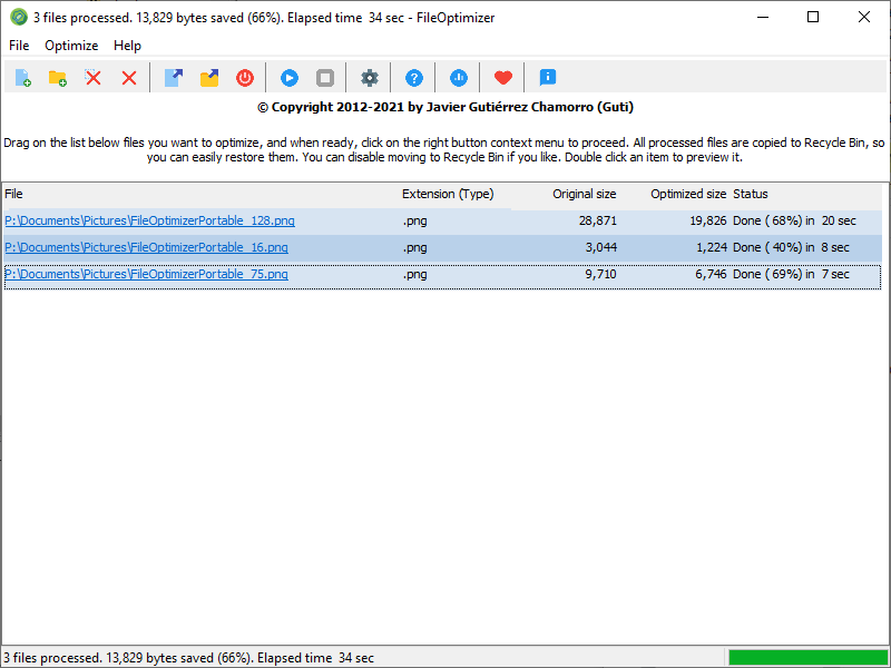 FileOptimizer is an advanced file optimizer featuring a lossless (no quality loss) file size reduction that supports hundreds of file formats including audio, video, images, databases, office formats, and more. FileOptimizer compresses already compressed files further without changing the file format, and being totally compatible. It keeps the behavior of the file untouched, but with its size reduced thanks to several recompression and optimization techniques. Both the 32-bit and 64-bit versions are included for maximum performance and compatibility.
