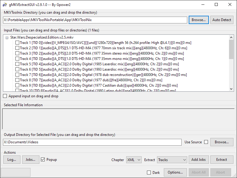 gMKVExtractGUI is small GUI utility to use mkvinfo and mkvextract cli tools from MKVToolnix pack, in order to extract tracks, chapters and CUE sheets from mkv files. It uses the components of MKVToolNix Portable which must be installed alongside.