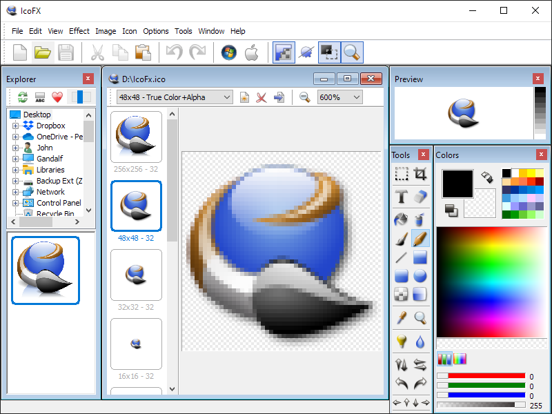 IcoFX is an award winning freeware icon editor. It is an all-in-one solution for icon creation, extraction and editing. IcoFX has support for PNG compression icons for Windows Vista and later, MacOS iconx, conversion between Windows and Mac icons, icon libraries, website favicons, adding/changing/deleting icons in EXE files, alpha transparency, effects, 256x256 icons, true color + alpha, icon extraction from DLLs and EXEs, import and export of images, and more.