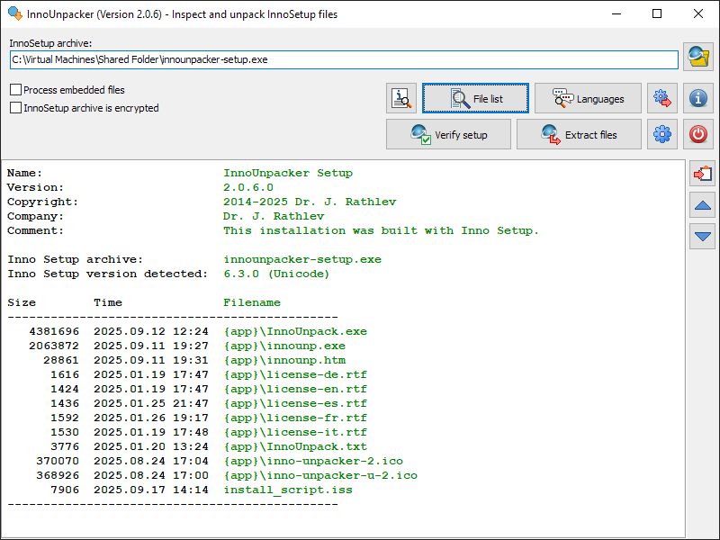 InnoUnpacker Portable is an InnoSetup inspector and extractor for InnoSetup EXE files. You can see what files are contained in an InnoSetup file, verify the installer, and optionally extract the files.