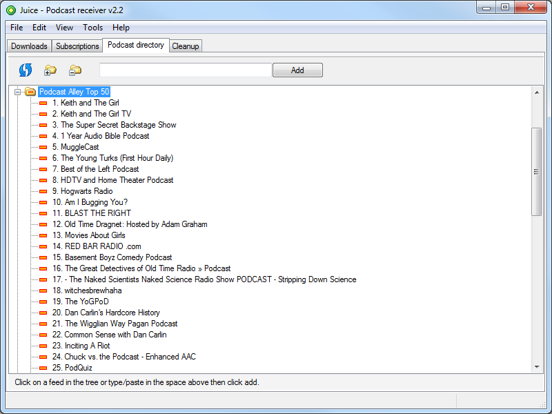 Juice is a podcast receiver that will download and manage your podcast subscriptions. Juice allows you to download and manage your various podcast subscriptions. It has a large built-in directory of podcasts (though some are no longer active). You can play a downloaded podcast directly in Windows Media Player.