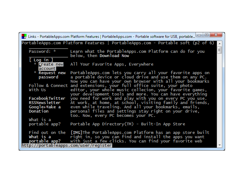 Links is an advanced text-based web browser with support for HTML4 (no CSS), HTTP 1.1, tables, frames, and more. Full keyboard shortcut support like q to quite and g to go to a URL (see the included help.html for details). Note: Files should not be associated with this browser due to some bugs.