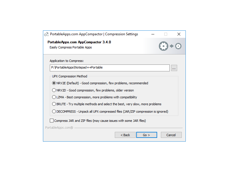 PortableApps.com AppCompactor allows you to easily compress application to decrease size on disk and increase performance when running from a slow media (like flash drives). It features: