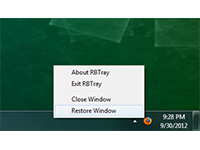RBTray lets you minimize running app windows to the system try. RBTray has no user interface or icon of its own. While running, you can minimize most windows to the system tray by right-clicking on the window's minimize button. You can also minimize by holding SHIFT and right-clicking the title bar of an app or pressing WIN-ALT-DOWN ARROW on the keyboard to minimize the active window. To exit RBTray, right-click on one of the minimized application icons in the system tray and select exit. Or run RBTray Portable again and you will be asked if you want to close the running copy.