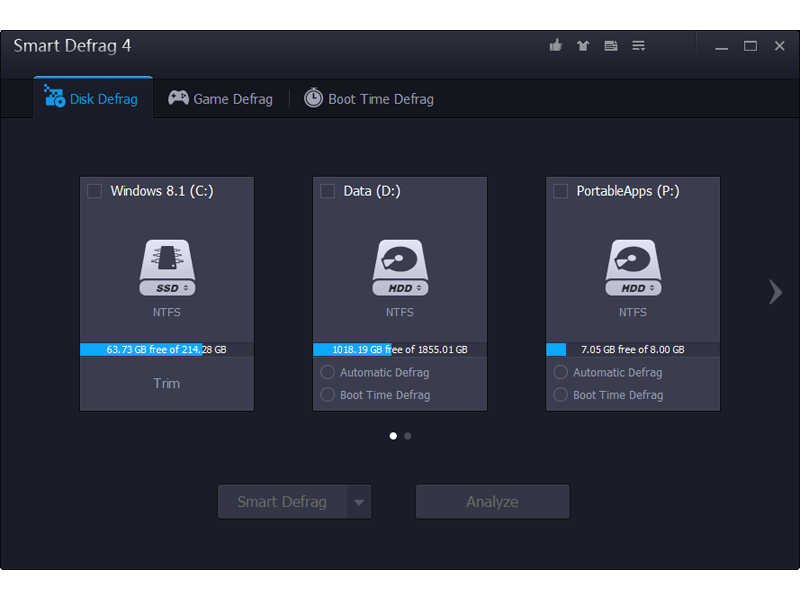 Smart Defrag is a powerful disk defragmenter with a fast engine and an easy to use interface. It's freeware for personal and business use. Like all defrag utilities, this requires admin privileges to run. It's been specially designed for modern, large hard drives, so it eliminates long waiting time. Smart Defrag doesn't just use simple defragmentation. It also streamlines your file system, places the frequently used files and directories into the fastest area of the disk, enabling your computer to run at top speed with the most stability. Its intuitive interface makes Smart Defrag the ideal utility for complete computer novice. Note that boot time defrag is not supported with the portable version and should not be used.