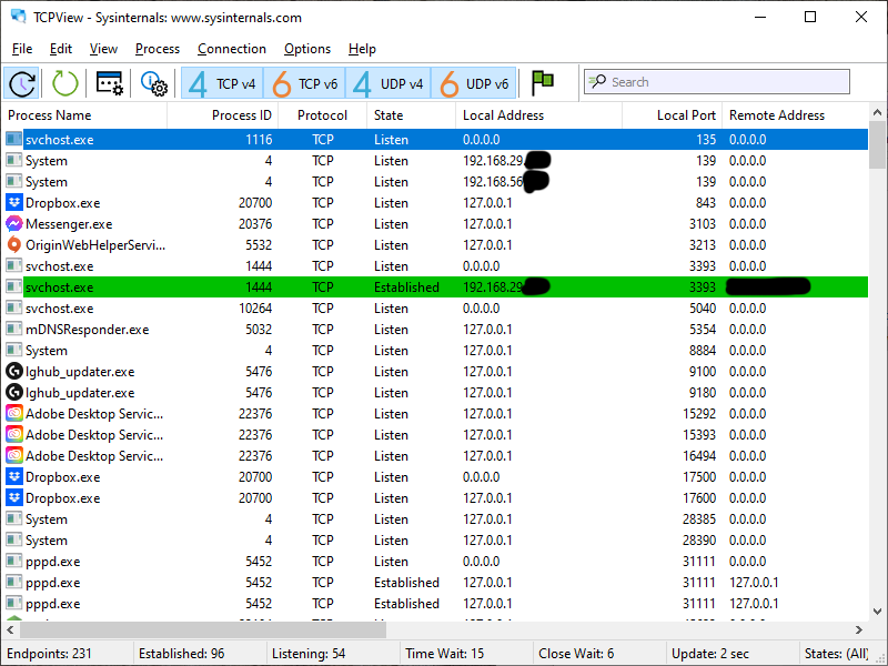 From the publisher: "TCPView is a Windows program that will show you detailed listings of all TCP and UDP endpoints on your system, including the local and remote addresses and state of TCP connections. TCPView also reports the name of the process that owns the endpoint. TCPView provides a more informative and conveniently presented subset of the Netstat program that ships with Windows."