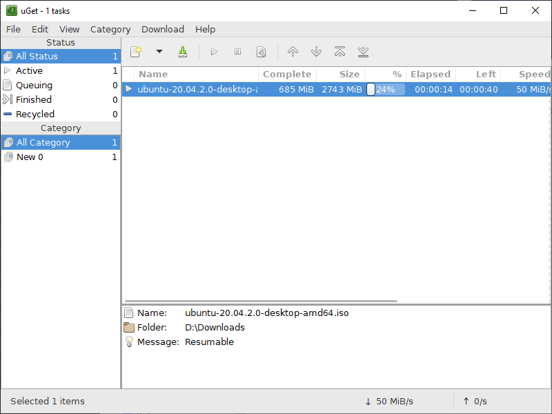 uGet is a lightweight download manager with powerful features. It supports multi-connection downloads, a queue manager, pause/resume, a clipboard monitor, and more.