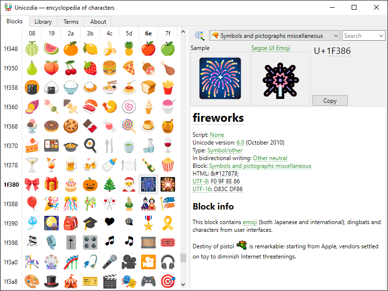 Unicodia is a Unicode character browser that lets you explore all Unicode characters/Emojis on your system as well as the fonts that support them. It allows you to copy out character codes in HTML, UTF-8 and UTF-16. It includes a search as well as an Emoji browser.