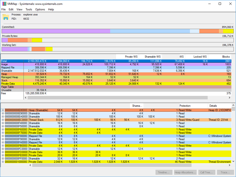 From the publisher: "VMMap is a process virtual and physical memory analysis utility. It shows a breakdown of a process's committed virtual memory types as well as the amount of physical memory (working set) assigned by the operating system to those types. Besides graphical representations of memory usage, VMMap also shows summary information and a detailed process memory map. Powerful filtering and refresh capabilities allow you to identify the sources of process memory usage and the memory cost of application features. Besides flexible views for analyzing live processes, VMMap supports the export of data in multiple forms, including a native format that preserves all the information so that you can load back in. It also includes command-line options that enable scripting scenarios. VMMap is the ideal tool for developers wanting to understand and optimize their application's memory resource usage."