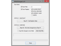 WhatChanged is a system utility that scans for modified files and registry entries. It is useful for checking program installations. There are two steps for using WhatChanged: 1) First, take a snapshot to get the current state of the computer; 2) Second, run it again to check the differences since the previous snapshot. WhatChanged uses the 'brute force method' to check files and the registry.