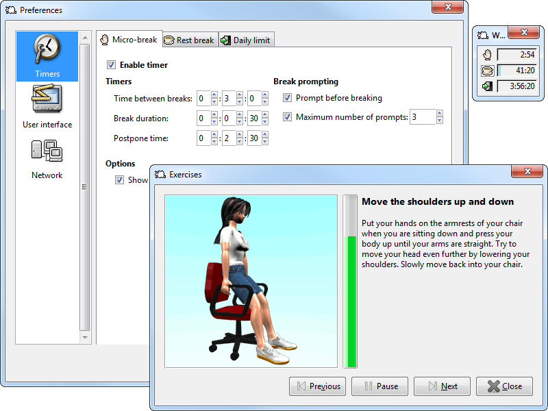 Workrave is a free program that assists in the recovery and prevention of Repetitive Strain Injury (RSI). It monitors your keyboard and mouse usage and using this information, it frequently alerts you to take microbreaks, rest breaks and restricts you to your daily computer usage.