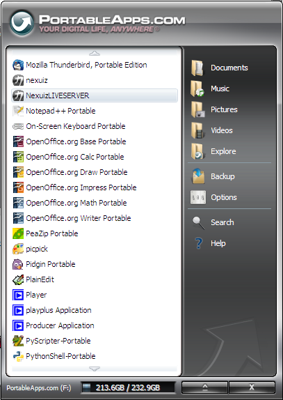 I am a new user of PortableApps. And I must say, what a wonderful job the developers have done. I also was wondering if I could make a few suggestion since 2.0 beta 4 is still on-going. What is the possibility of adding an search box on the menu to search the contents of the drive? And something less critical, how about the ability to customize the left-hand-side menu; as in creating shortcuts for any program/file from any part of the drive.