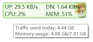 It displays the current internet speed and CPU and RAM usage (only with Standard version. There are also other capabilities like an embedded display in the taksbar, changeable display skins, and historical traffic statistics.