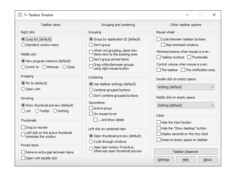 7+ Taskbar Tweaker allows you to configure various aspects of the Windows taskbar. Most of the configuration options it provides can’t be tweaked using the taskbar properties or the registry. The tweaker is designed for Windows 7, Windows 8, and Windows 10. It will work on Windows 11 with the legacy taskbar enabled.