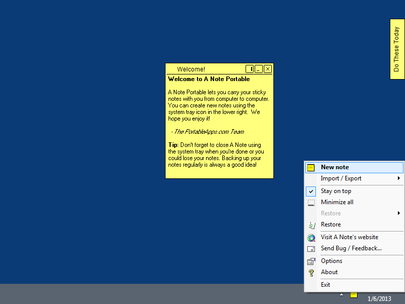 A Note is a lightweight sticky note app with support for different color notes, fonts, alarms, docking to the side of the screen, and more.