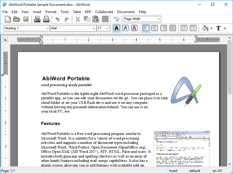 AbiWord Portable is a free word processing program similar to Microsoft Word. It is suitable for a variety of word processing activities and supports a number of document types including Microsoft Word, Word Perfect, Open Document (OpenOffice.org), Office Open XML (MS Word 2007), RTF, HTML, Palm and more. It includes both grammar and spelling checkers as well as an array of other handy features including mail merge capabilities. It also has a plugin system allowing you to add features with available add-on plugins.