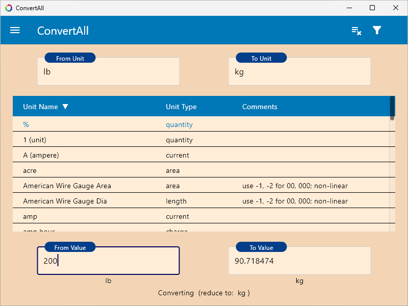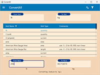 ConvertAll is a unit conversion utility. The base units for conversion may be either typed (with auto-completion) or selected from a list. Units may be selected using either an abbreviation or a full name. Units may be combined with the * and / operators. Units may be raised to powers with the ^ operator. Units with non-linear scales, such as temperature, can also be converted. A unit list may be filtered and searched. Numbers may be entered on either the From or the To units side, for conversions in both directions. Basic mathematical expressions may be entered in place of numbers. Options control the formatting of numerical results. The unit data includes over 400 units. The format of the unit data file makes it easy to add additional units.
