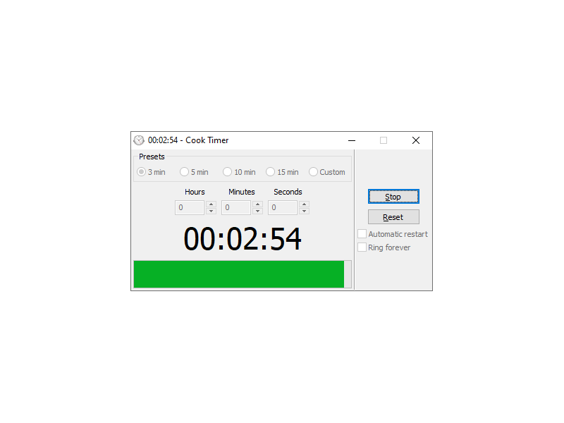 Cook Timer has presets for 3, 5, 10 and 15 minutes and lets you set a custom time in hours, minutes and seconds. A progress bar lets you easily see the time remaining visually. An alarm will beep briefly when time is up. It can optionally be set to beep until you disable it. The timer can also automatically restart once time is up allowing you to mark off a specific amount of time continuously.