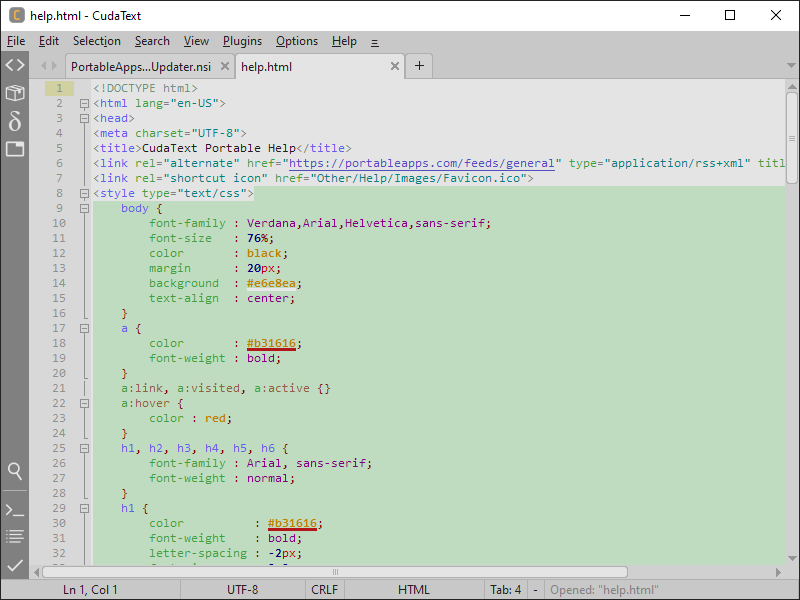 CudaText is a cross-platform text editor, written in Object Pascal language using the Lazarus IDE, with a focus on performance and a broad featureset, which includes: Syntax highlighting for 300+ languages; Multi-carets, multi-selections; Code folding; Code-tree (list of functions/classes/etc., if lexer-supported); Search/replace with regular expressions; Command palette; Configs in JSON files; Interface- and syntax-themes; Support for many encodings; Based on the ATSynEdit engine; Extensibility via Python plug-ins, e.g. LSP support; Built-in HTML and CSS auto-completion; HTML tag completion with: HTML tooltips on mouse-over, Hex color code underlining, Viewer for picture files (jpeg, png, gif, bmp, ico, webp)