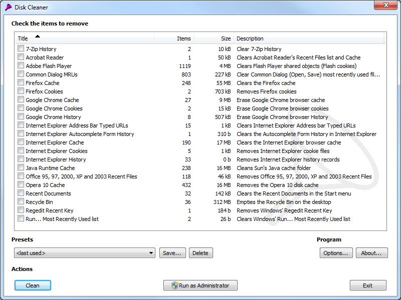 Disk Cleaner is a free tool to quickly and easily clean your hard disk from temporary files like those in the system temporary folder, the Internet Explorer Cache and Cookies folder, and the Recycle Bin. It is very easy to use: select the items you would like to clean, press the clean button, and you're done! Despite the ease of use, the extendibility by plug-ins, which in fact are just simple text files, make that Disk Cleaner can also be used by power users to clean specific items. All that is needed to create a simple plug-in is a text editor, such as notepad.