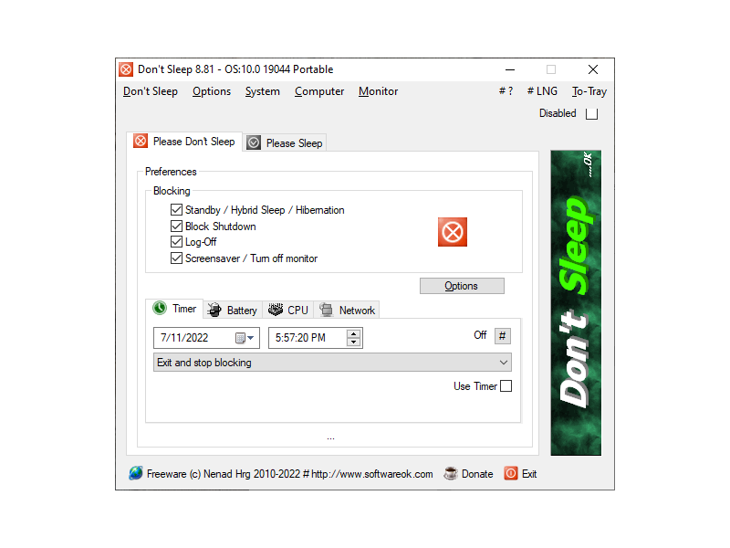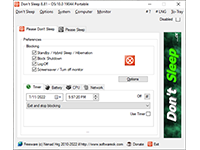 Don't Sleep Portable is a utility to prevent a PC from sleeping based on time and battery levels. It also prevents login off the computer, and the deactivation of the monitor or activation of the screen saver.