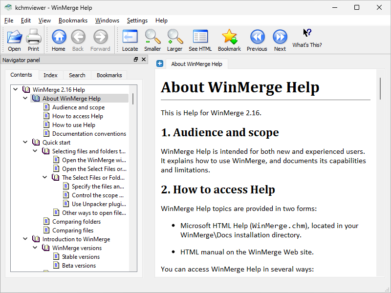 KchmViewer is a full-featured CHM (MS HTML help file format) viewer with support for a wide range of languages and encodings, persistent bookmarks, tab-based browsing, full-screen support and more. CHM files are often used as help files for applications and sometimes used for ebooks and instructional manuals.