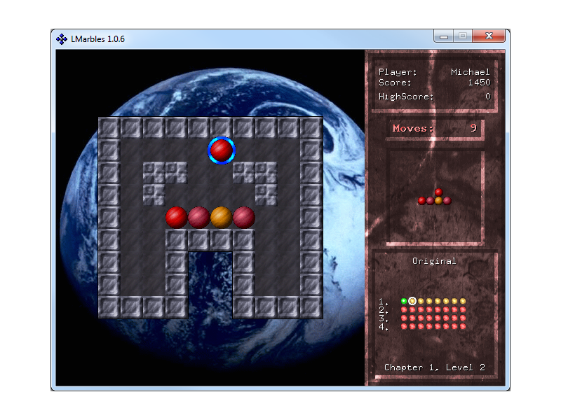LMarbles is a layout-matching puzzle game. An arrangement of marbles is presented and you must match it using the marbles on the board. If a marble starts to move it will not stop until it hits a wall or another marble. To make it more interesting there are obstacles like one-way streets, crumbling walls and portals.