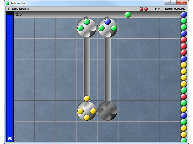 Pathological is an enriched clone of the game "Logical" by Rainbow Arts. To solve a level, fill each wheel with four marbles of matching color. Various board elements such as teleporters, switches, filters, etc., make the game interesting and challenging. New levels can be created using your favorite text editor.