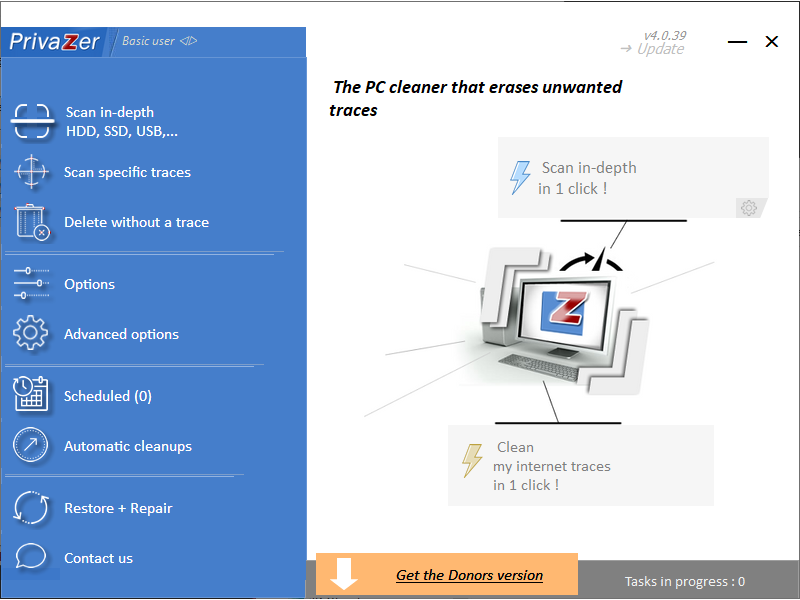 PrivaZer is a PC cleaner and privacy tool that can clean browser cookies, registry traces, frequently opened lists, invalid shortcuts, thumbnails, prefetch cache, USB device history, securely erase files and free space, and more. PrivaZer requires admin rights when logged in as an admin.