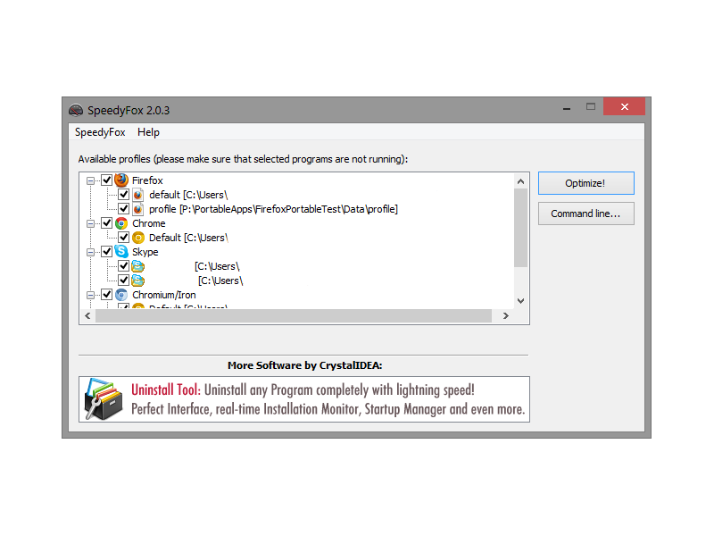 SpeedyFox optimizes the sqlite databases that many apps use to store their settings, bookmarks, history and other data. It works with Mozilla Firefox, Mozilla Thunderbird, Skype, Google Chrome, SRWare Iron, and more. It will list and pre-select to optimize all the local apps it finds. And, in a PortableApps.com exclusive, the portable version will automatically detect and set itself to optimize Mozilla Firefox, Portable Edition (stable, ESR and Test); Mozilla Thunderbird, Portable Edition (stable, ESR and Test); Google Chrome Portable (Stable, Beta and Dev); and Iron Portable.