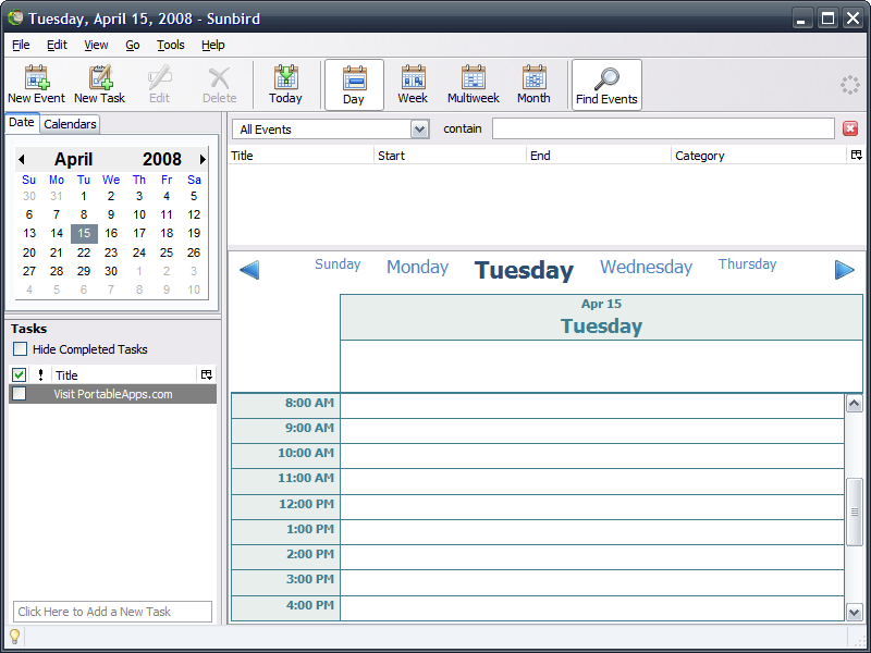 Sunbird Portable is a standalone calendaring and task management application built on the same technology as the Firefox web browser. It's easy to use and makes keeping your calendar and tasks up-to-date a breeze. Plus, it leaves no personal information behind on the machine you run it on, so you can take your schedule and to do lists with you wherever you go.