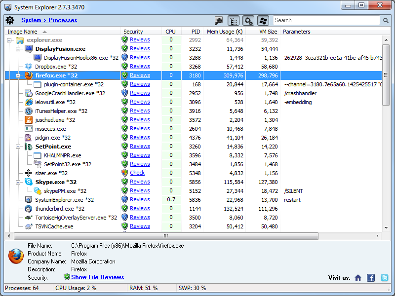 Displays detailed information about Tasks, Processes, Modules, Startups, IE Addons, Uninstallers, Windows, Services, Drivers, Connections and Opened Files. Easy check of suspicious files via VirusTotal, Jotti service or our File Database. Easy monitoring of processes activities and System changes. Usage graphs of important System resources. Tray Hint with detailed System and Battery status. WMI Browser and System Additional Info. System Explorer's functionality requires admin rights to run.