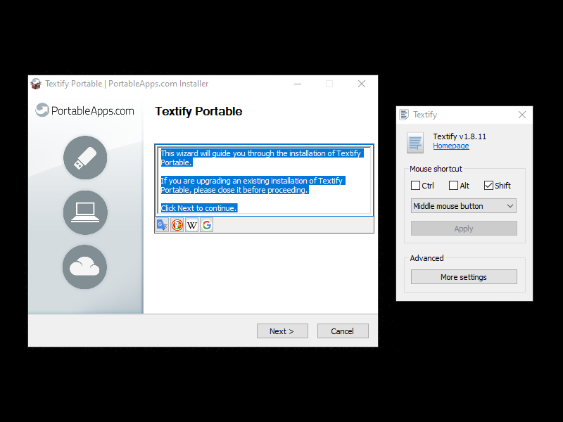 Textify Portable is text capture and translation utility to get text from dialog boxes and other Windows elements that don't normally support copying. Textify was created to solve this problem: you can point your mouse over the text, click on the mouse shortcut (Shift + Middle click by default), and get a selectable view of the text. The text can then be copied, sent to Google Translate, Wikipedia search, and other customizable locations.
