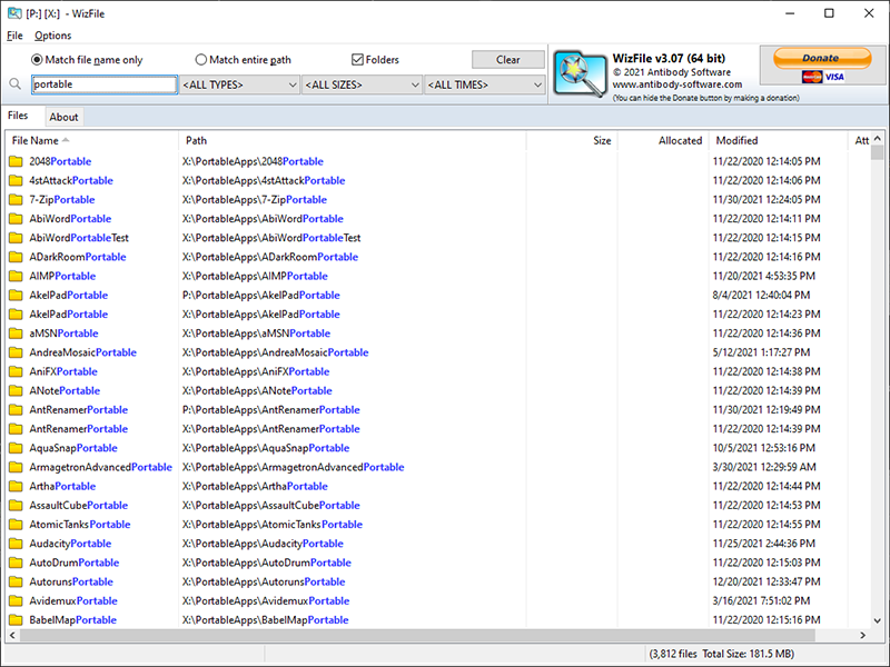 WizFile is a very high speed file and folder search. File search results are returned instantly as you type. WizFile provides a real time view of all files on your hard drives - any changes to the file search results will be updated in real time as they occur. When scanning NTFS formatted drives, WizFile reads the hard drive's Master File Table (MFT) directly from the disk. This is the fastest way to load file information from a hard drive, and allows WizFile to be ready for use very quickly after it's started. WizFile requires admin rights to function.